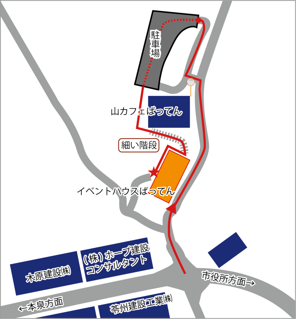 落ち着いた雰囲気の「イベントハウスばってん」で、ゆったりとした時間をお過ごしいただけます。駐車場は山カフェばってんの駐車場をご利用ください。